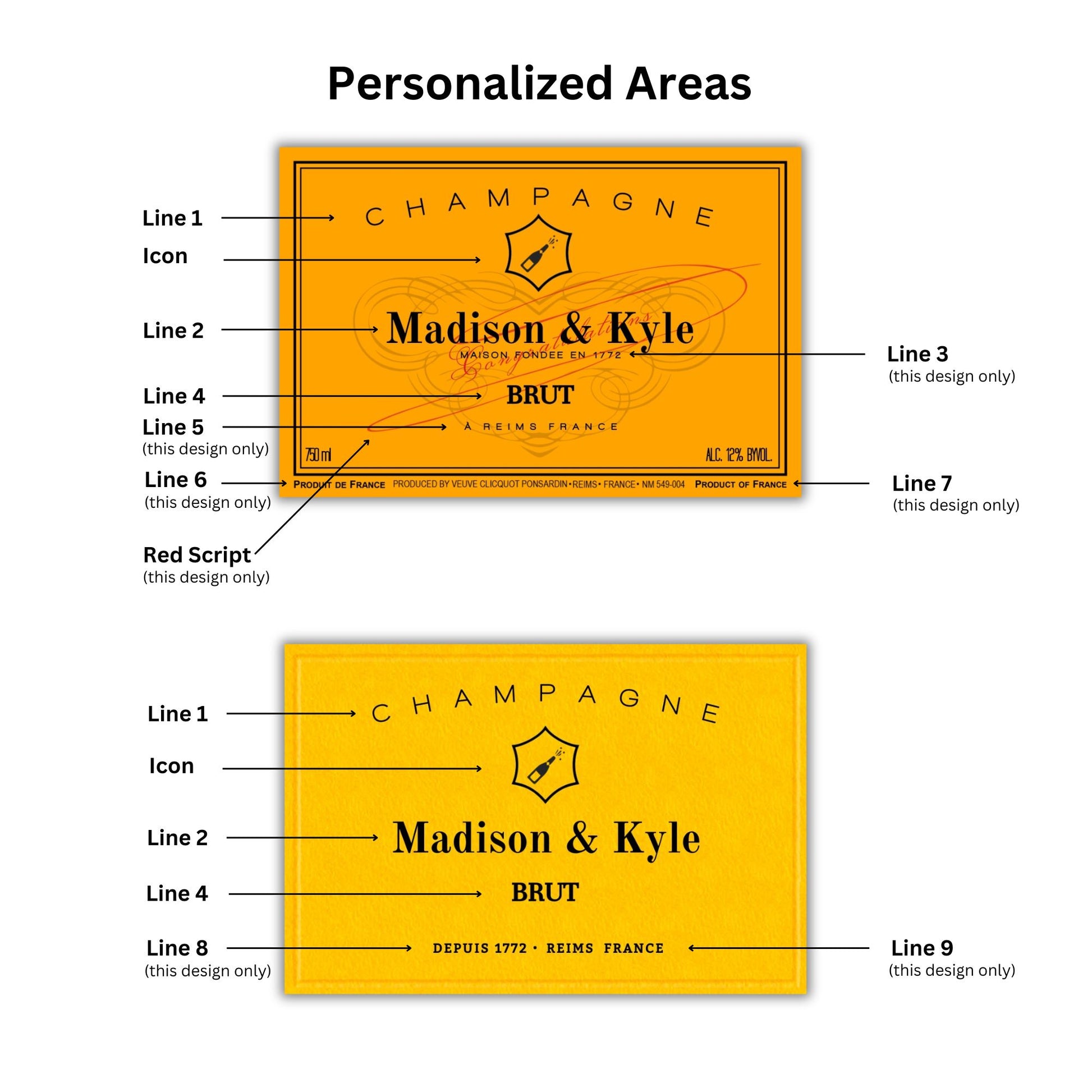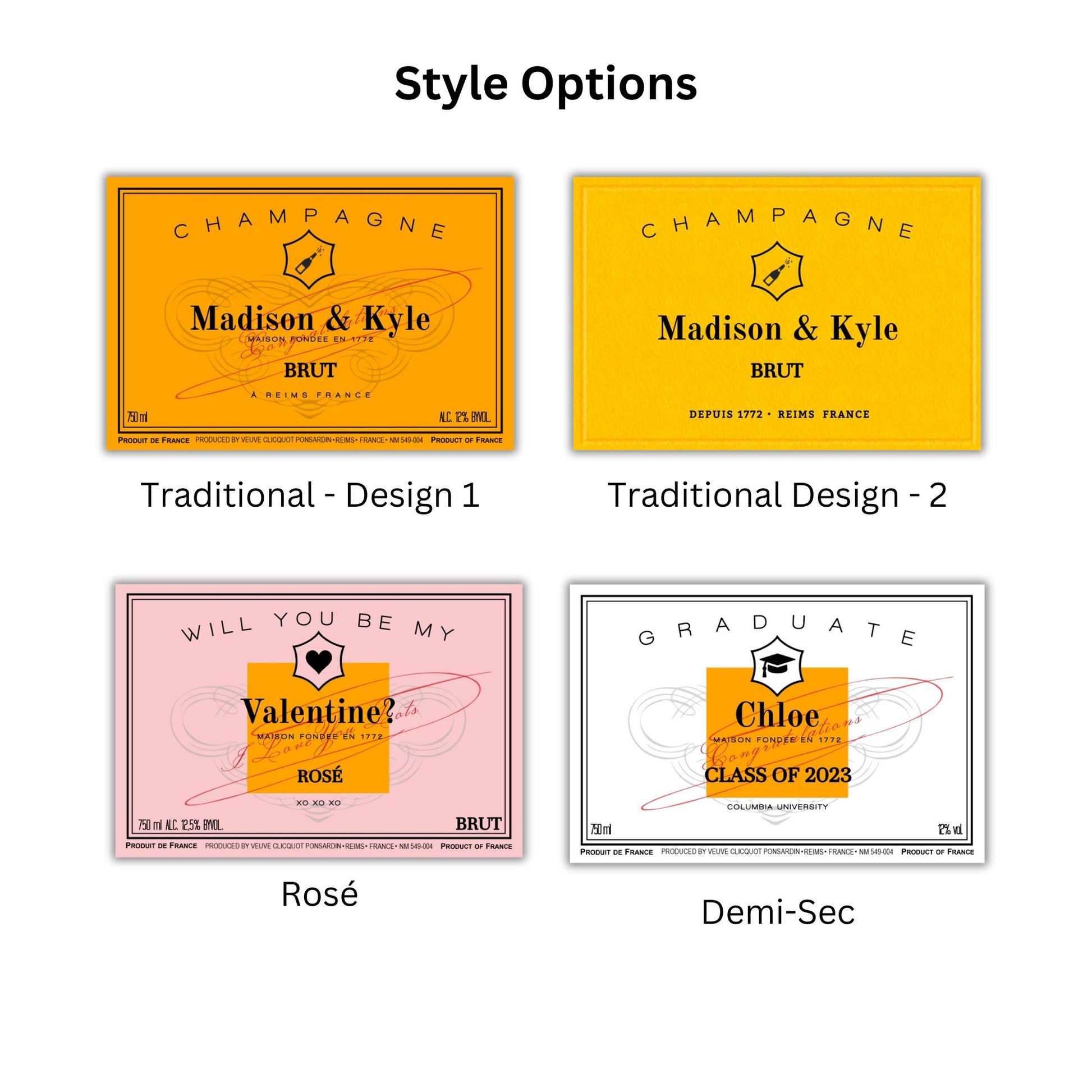 Personalized Champagne Bottle Labels. Available in 375ml, 750ml & 1.5L Bottle Sizes! Choose from the Traditional, Rosé or Demo-Sec style labels. Custom for any Special Occasion! Colors from screen to printer can vary a little. We try to get as close as possible to the original colors