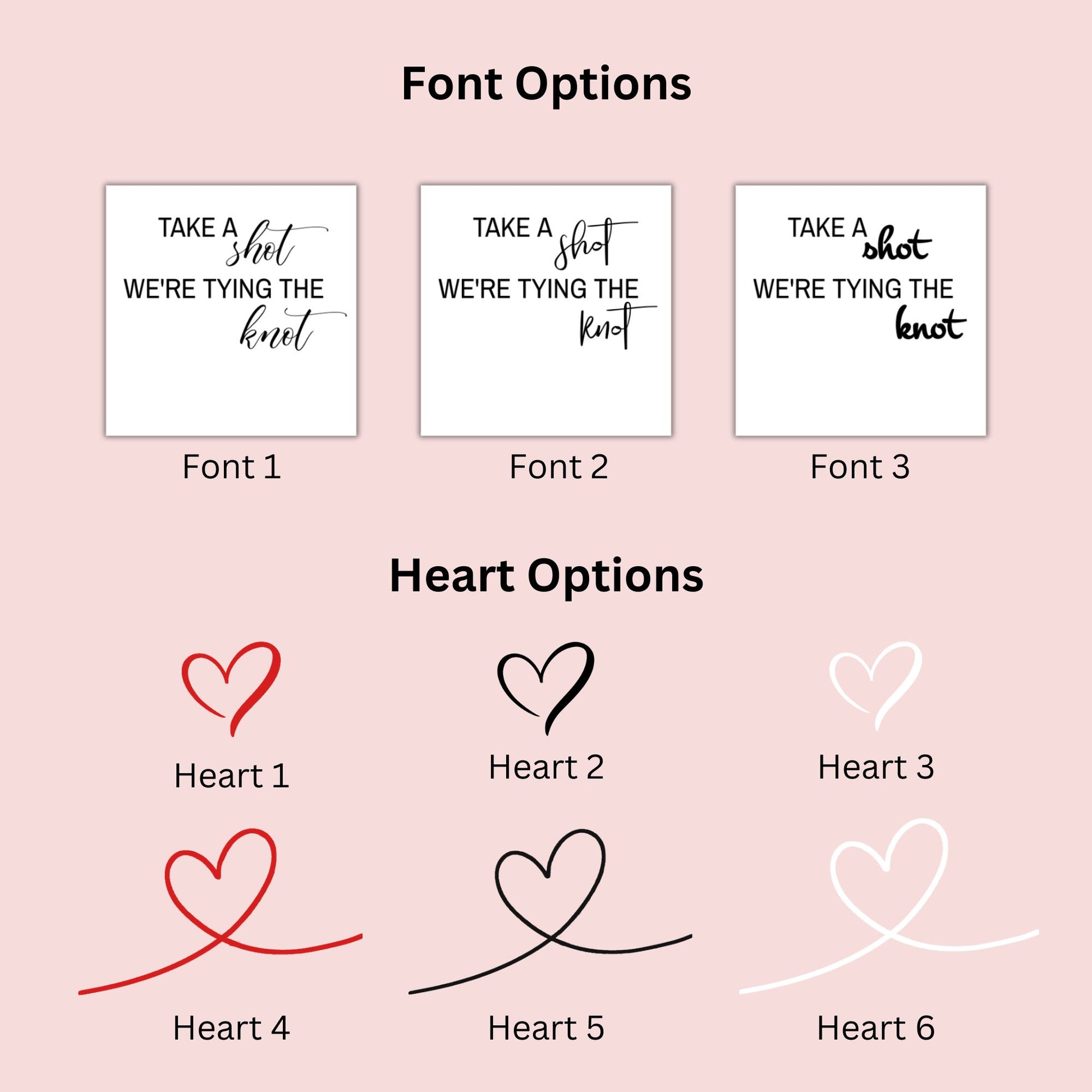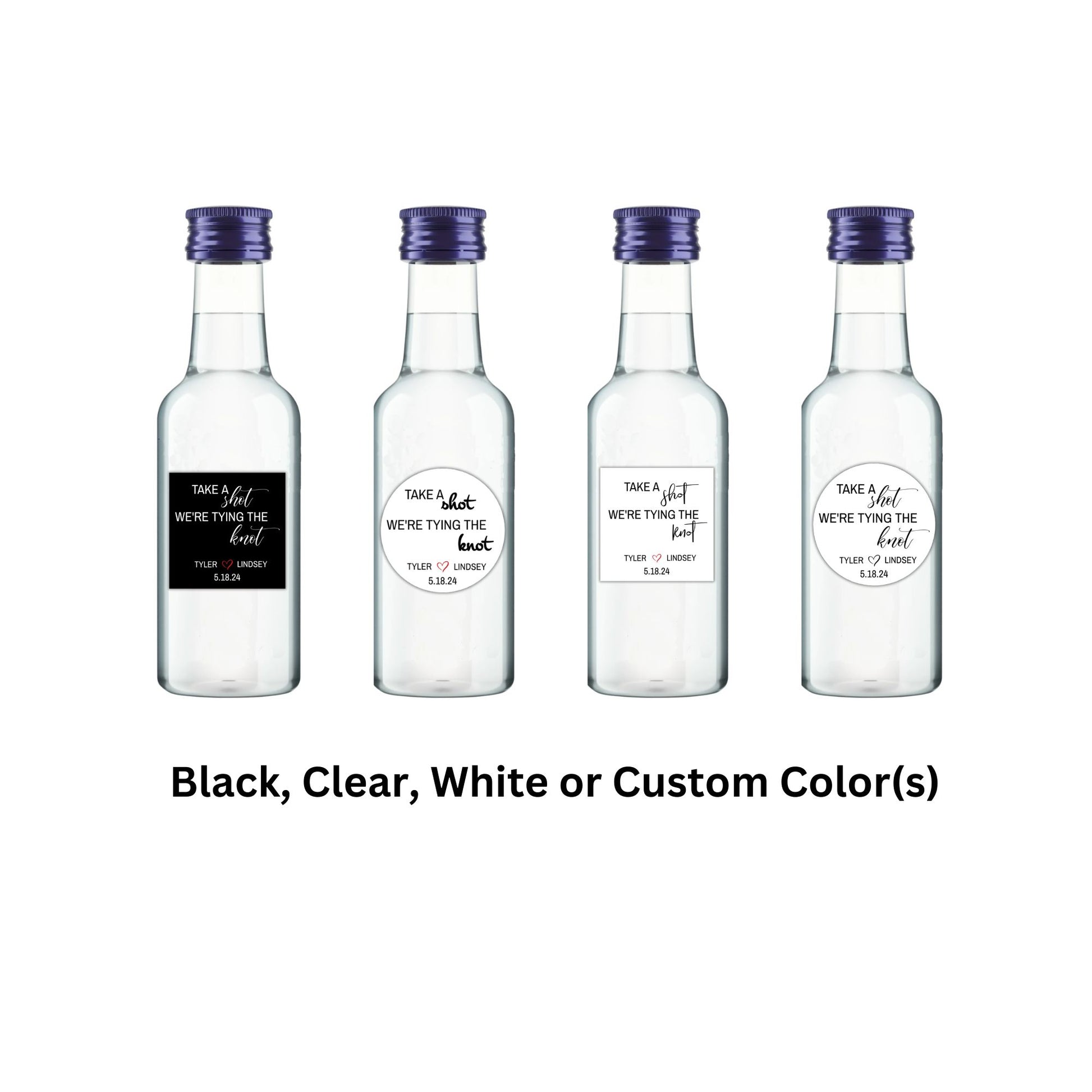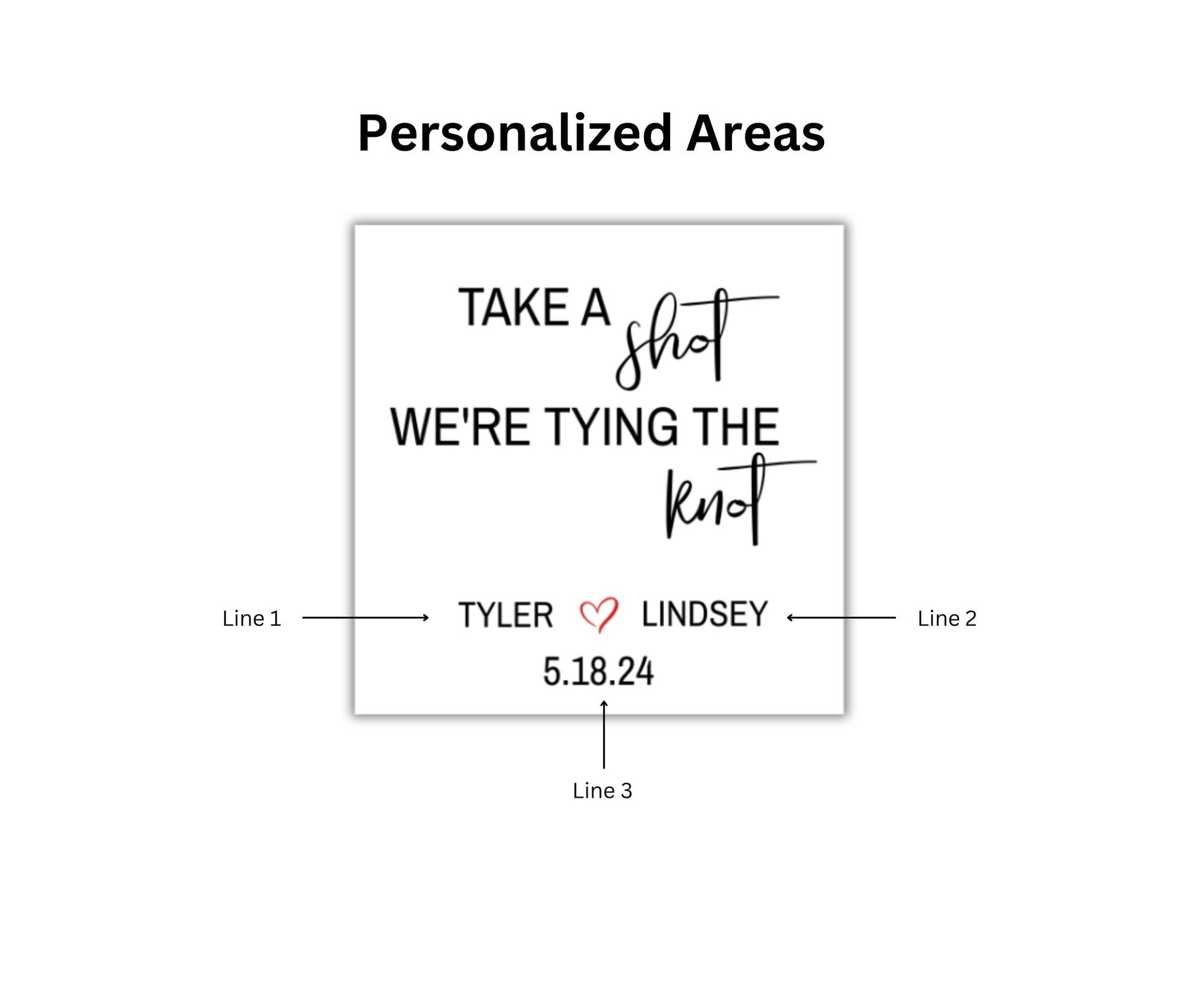 Take A Shot We're Tying The Knot Stickers/Labels. Personalize with details of your special day. Stickers available in Clear, White, or Custom Color(s). (For Custom colors, please provide the HEX color number you would like). Free US Shipping.
