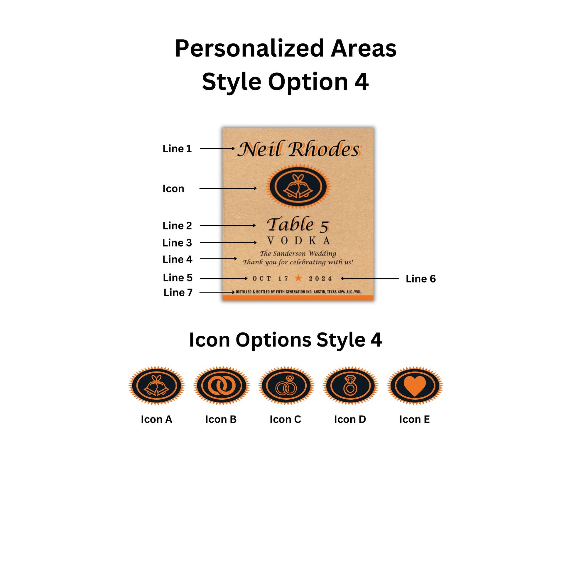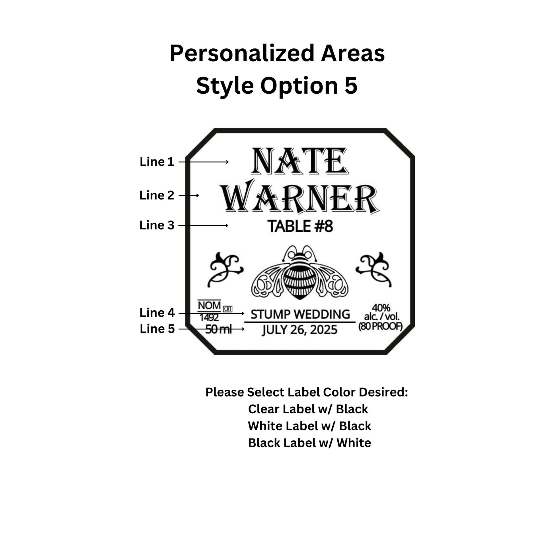 Personalize your Wedding Seating Chart with Mini Shot 50ml Bottle Labels. Make each label custom for your Special Day! Available in Tequila, Vodka and Whiskey labels. Design fee for each label being personalized is included in the pricing. Large orders shipped within 10 business days, but usually ship sooner.